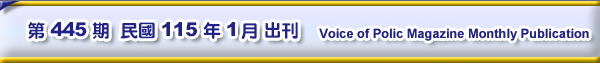 ■ 四、捐款芳名錄、版權頁 ★ 歡迎加入永久會員,繼續踴躍捐助印製費 ★ 捐款芳名錄 ★ 警聲稿約、捐款及總會會員繳費方式 ★ 歡迎以繳年費方式/訂閱警聲月刊雜誌 ★ 115年元月總會活動看板
